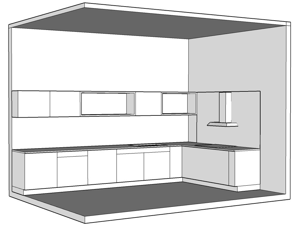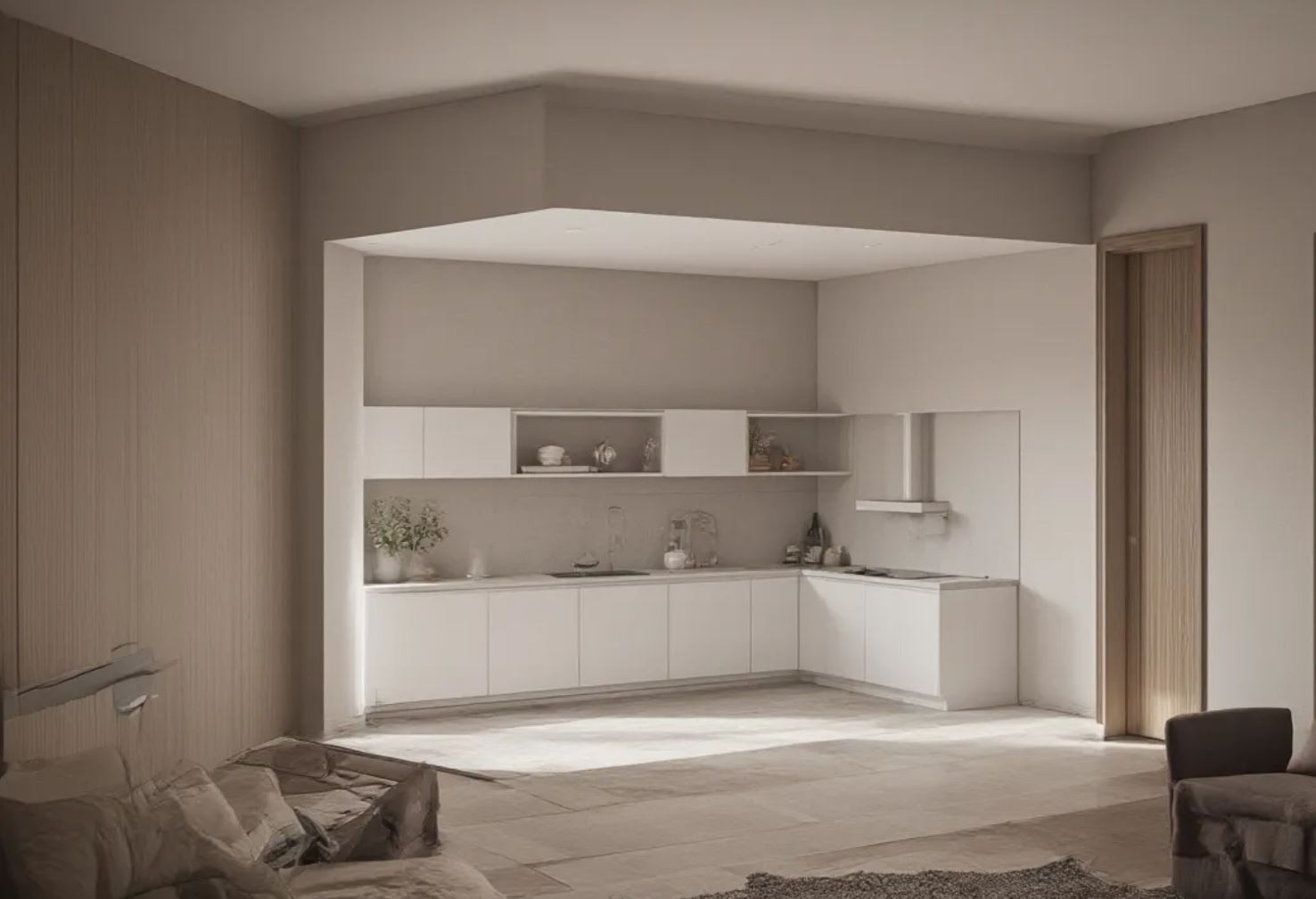 Tu je príklad naškicovanej kuchyne / 5 min. v Sketchup-e / ktorú AI vyrenderovala a zasadila do popísaného interiéru / 7min./